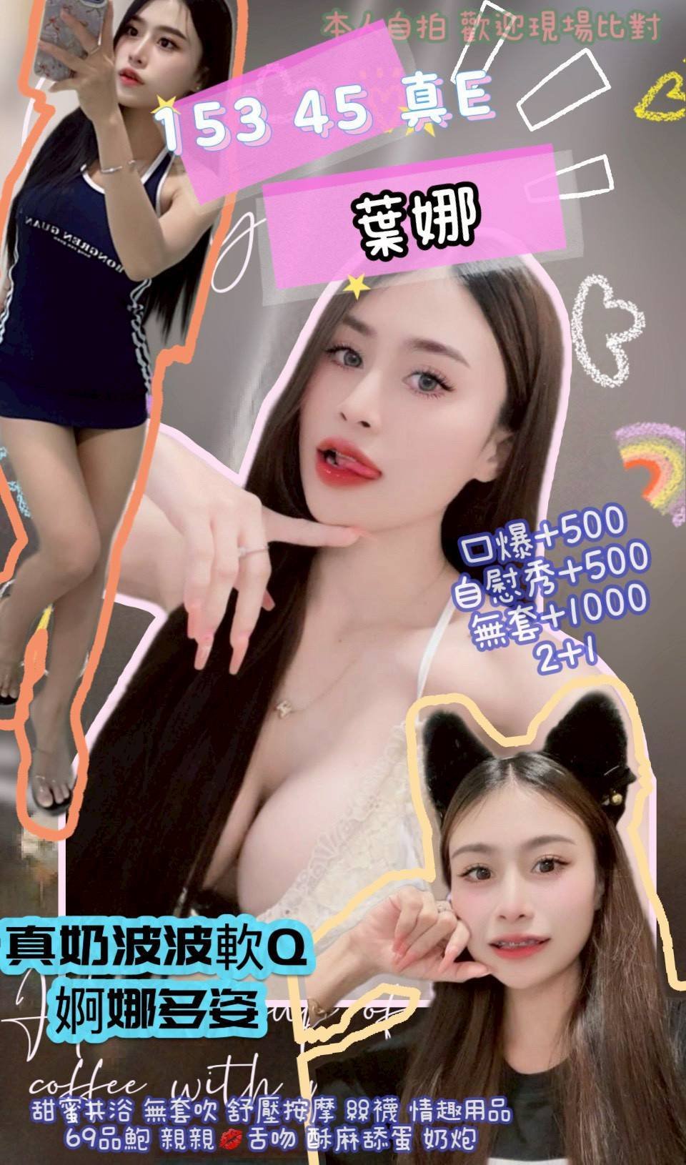 無套吹 戴套做 鴛鴦浴 小親嘴 舌吻(視衛生) 69 品鮑 按摩 奶炮 舔蛋 絲襪 口爆+0.5K 自慰秀+0.5K 無套內射+1K 買兩節送1S