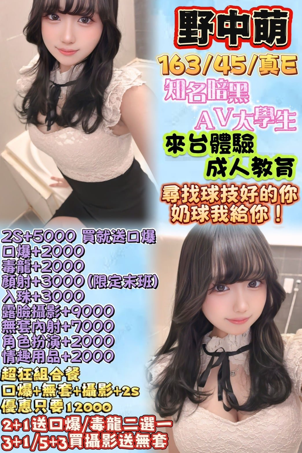 無套吹 戴套做 鴛鴦浴 小親嘴 舌吻(視衛生) 69 品鮑 按摩 奶炮 舔蛋 絲襪 2S+5K買就送口爆 口爆+2K 毒龍+2K 顏射+3K(限定末班) 入珠+3K 露臉攝影+9K 無套內射+7K 角色扮演(服裝需自備)+2K 情趣用品(需自備新品)+2K 超狂組合餐 口爆+無套+攝影+2S只要12K 買兩節送一節 買三節送一節 買五送三節(包夜23:00開始)