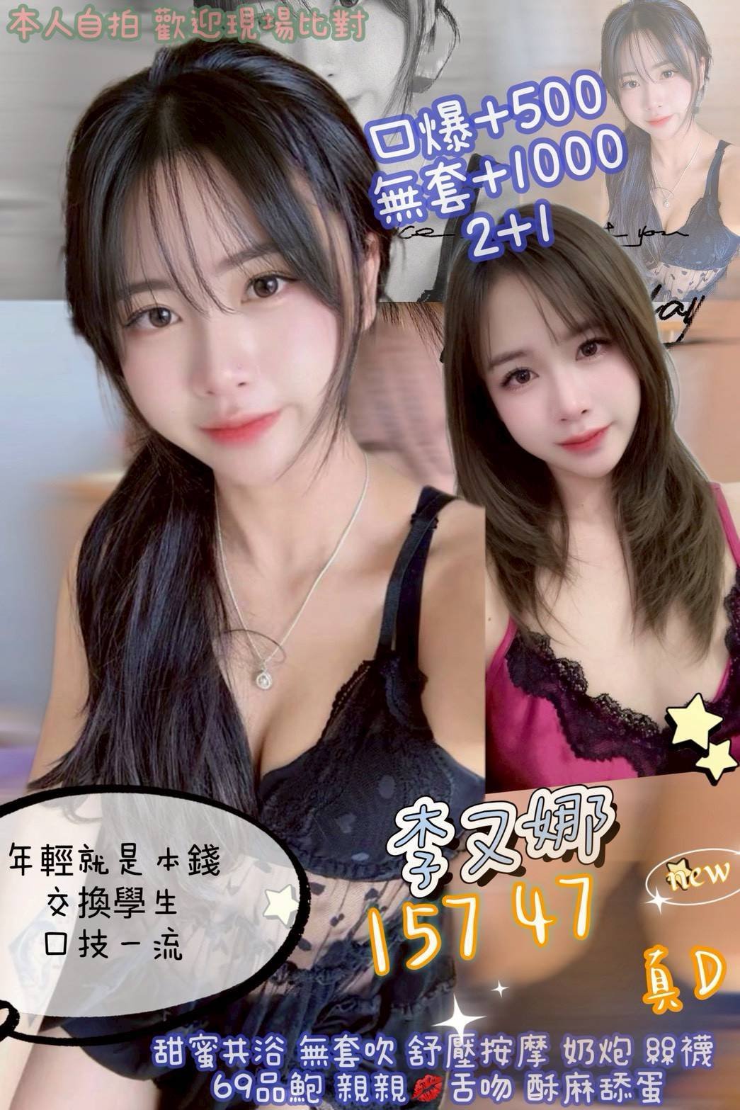 無套吹 戴套做 鴛鴦浴 小親嘴 舌吻(視衛生) 69 品鮑 按摩 奶炮 胸推 臀推 舔蛋 絲襪 口爆+0.5K 無套內射+1K 買兩節送1S